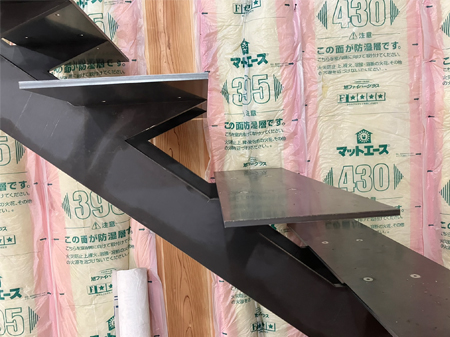 外壁はアスファルトフェルトの上からラス網が張られている状況を確認しました。 鉄骨階段も設置され上下階への空間のつながりができ、連続性が体感できてきました。 力桁と踏板の接合を溶接ではなくボルト固定として頂いたため、きれいに仕上がっていました。 バルコニー支持の鉄骨やサッシの下地スチールなど取付が始まり、 2階のダウンライトの位置が分かってきました。