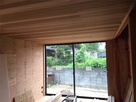 2階天井仕上は木毛セメント板の素地仕上とししています。 屋根はガルバリウム縦葺きとし、外壁は透湿防水シートの上から胴縁とラス板の杉材が張られ、、 アルミサッシの設置状況を確認しました。